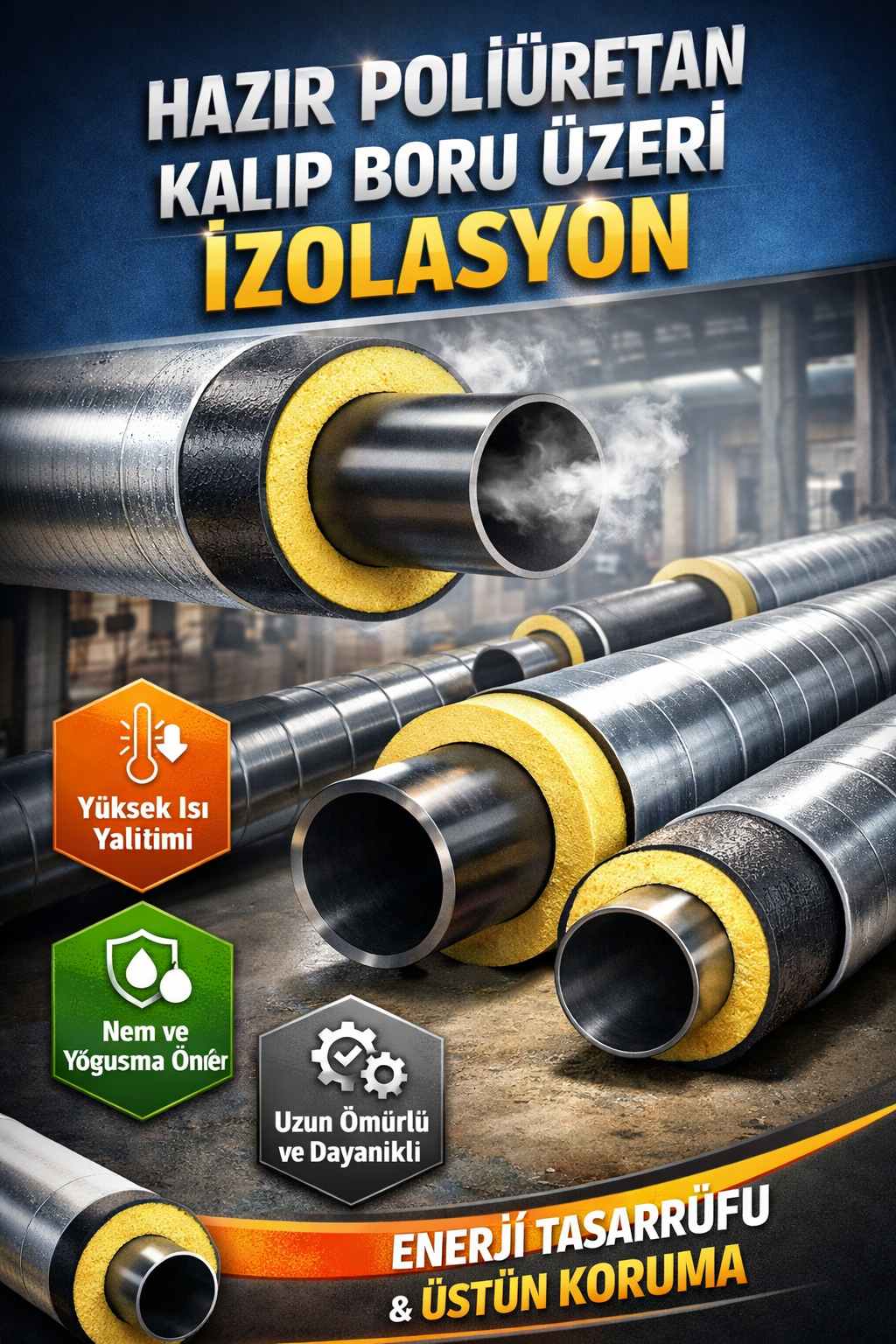 Hazır poliüretan kalıp boru üzeri izolasyon, ısı kayıplarını minimuma indirmek ve tesisat sistemlerinde maksimum enerji verimliliği sağlamak amacıyla kullanılan modern ve uzun ömürlü bir yalıtım çözümüdür. Özellikle ısıtma, soğutma, buhar ve sıcak su hatlarında yaygın olarak tercih edilmektedir.